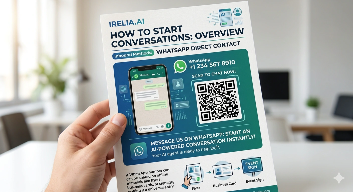 Every AI-powered conversation has to start somewhere. Maybe a prospect clicks your WhatsApp link and asks about pricing. Maybe they fill out a lead form on Instagram and receive a WhatsApp message within seconds. Maybe they comment on your Facebook post and get a private message moments later. Irelia supports all of these — and more. But with multiple channels, directions, and entry points available, it’s easy to wonder: which method should I use? This article is your map. It covers every available way to start a conversation with your Irelia AI agent, organized by the most important distinction: who sends the first message — the customer (inbound) or Irelia (outbound). You won’t find step-by-step setup instructions here. Instead, each method links to its dedicated configuration guide so you can dive deeper when you’re ready. By the end of this article, you’ll understand: ✅ The difference between inbound and outbound conversations in Irelia✅ Every available method for starting a conversation, across all supported channels